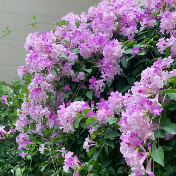 🌸Garlic vine is a beautiful and magical plant. Its flowers can change color over time. When it first blooms, the flowers are pink and purple. After a few days, they slowly turn pink and finally turn white and fall off. From a distance, it looks like a pink and purple gradient ocean. The three colors coexist, which is very romantic💗💜. Moreover, the number of garlic vine flowers is very large, and the flowering time is very long every year. It is a perfect climbing ornamental plant.